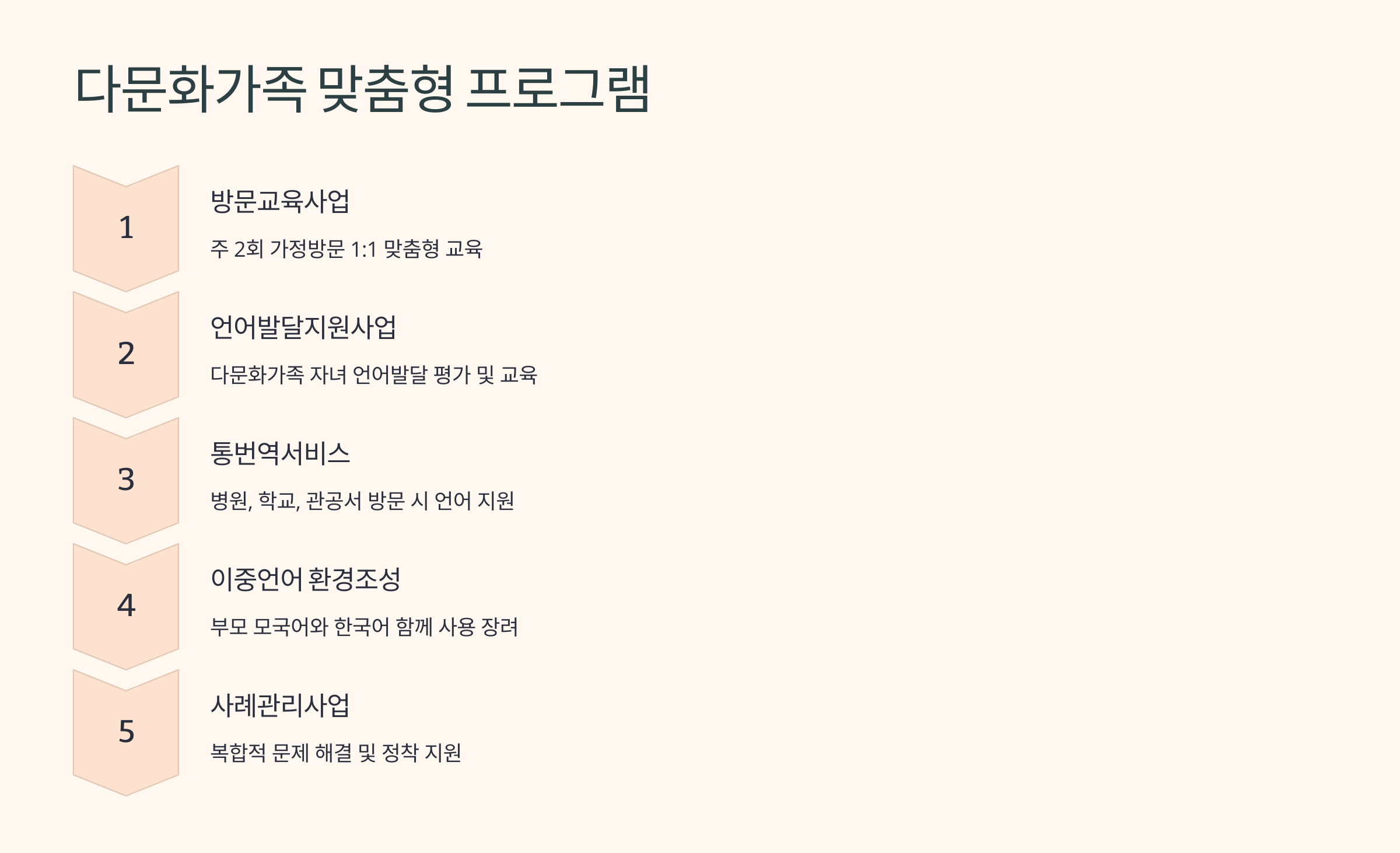 방문교육사업, 언어발달지원사업, 통번역서비스 지원사업, 이중언어 가족환경조성사업, 다문화가족 사례관리사업 등 다양한 지원 프로그램에 대한 정보를 제공해요. 이런 프로그램들을 통해 한국생활 적응과 가족 간의 소통을 돕고 있답니다.